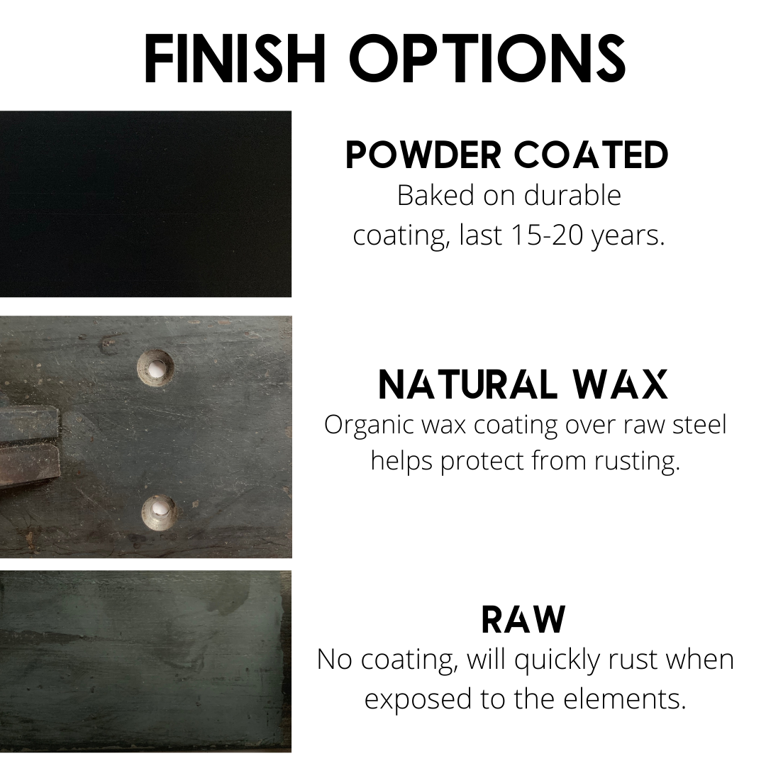 RAW STEEL: Please note, raw steel will rust fairly quickly depending on the environment. Over time, the rust will start to eat away at the steel. If you would like to spray paint yourself, it's recommended to clean with steel wool (like sanding wood) so the paint will stick well to the steel.
